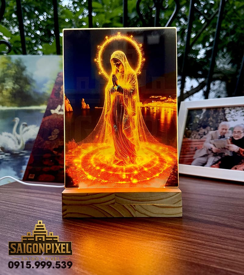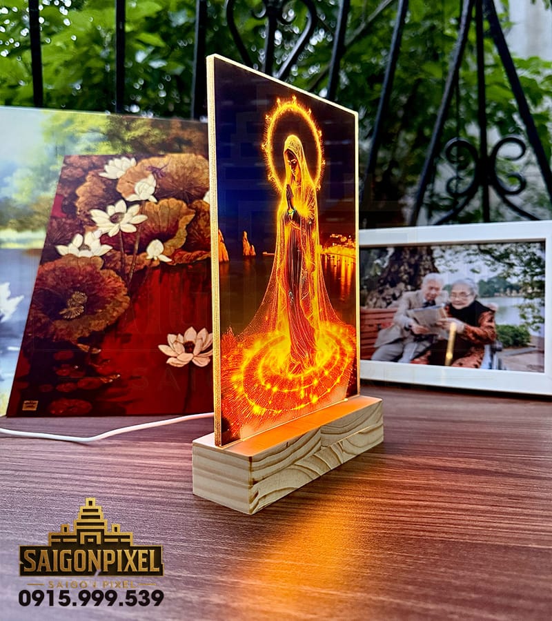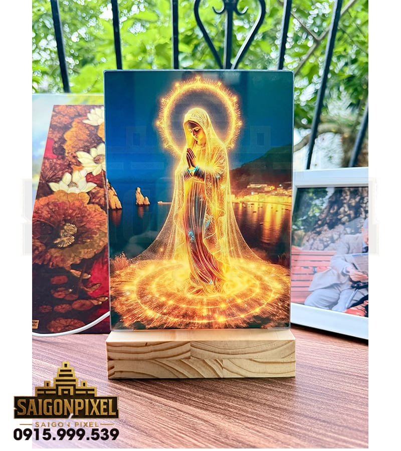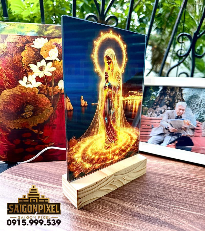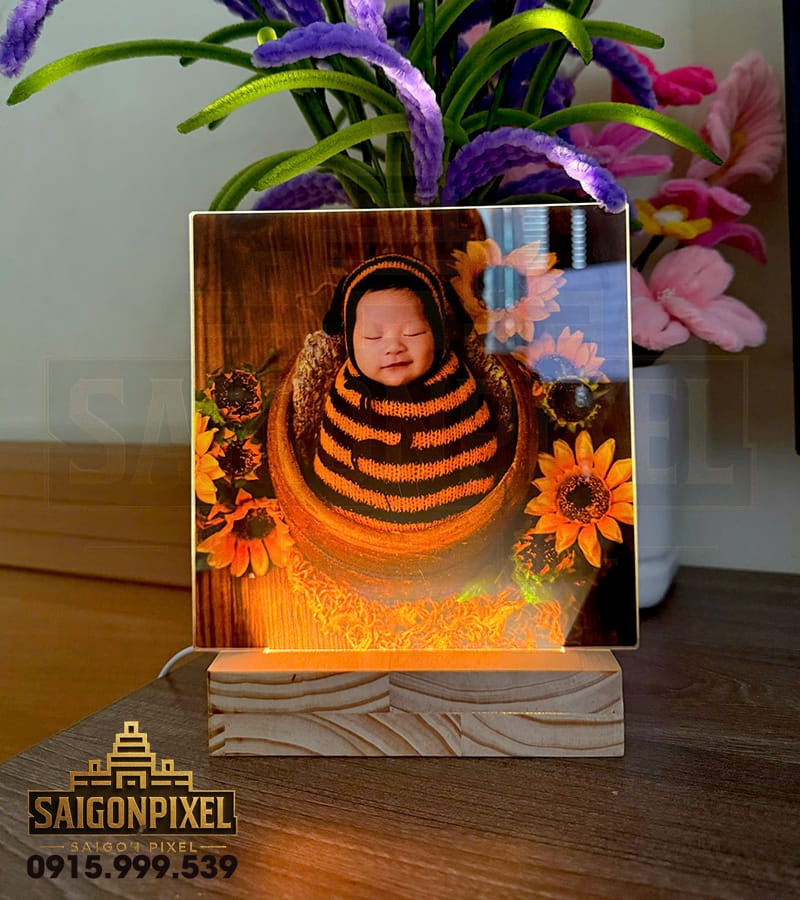 Ảnh mica đế đèn là sự kết hợp hoàn hảo giữa nghệ thuật in ảnh cao cấp và công nghệ chiếu sáng hiện đại. Ảnh được in trên chất liệu mica trong suốt, sắc nét và bền màu, đặt trên đế gỗ tích hợp đèn LED ánh vàng dịu, tạo nên hiệu ứng phát sáng sang trọng và ấm áp.