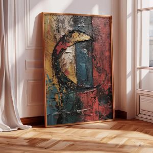 Bức tranh trừu tượng gây ấn tượng mạnh với hình ảnh bán nguyệt táo bạo, hòa quyện giữa các mảng màu vàng, xanh, đỏ và đen. Các lớp sơn dày, bề mặt kết cấu gồ ghề tạo hiệu ứng 3D đầy chiều sâu, giúp tác phẩm trở nên sống động và cuốn hút.