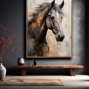 Bức tranh nổi bật với hình ảnh chú ngựa mạnh mẽ, uy nghi, được khắc họa bằng nét cọ phóng khoáng và bảng màu nâu – đen – be hài hòa. Các lớp màu loang tinh tế kết hợp với chi tiết sắc nét ở đôi mắt và bờm ngựa tạo nên chiều sâu cuốn hút, toát lên thần thái vừa tự do vừa kiêu hãnh.