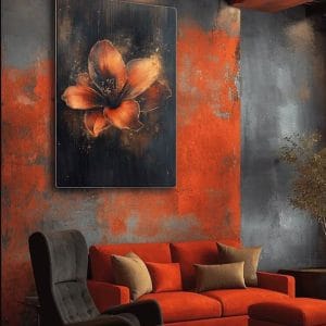 Bức tranh nổi bật với hình ảnh hoa lily cam nở rộ trên nền đen huyền bí, tạo hiệu ứng thị giác mạnh mẽ và cuốn hút. Cánh hoa mềm mại, được tô điểm bởi sắc cam rực rỡ kết hợp ánh vàng lấp lánh, mang đến cảm giác vừa ấm áp vừa sang trọng.